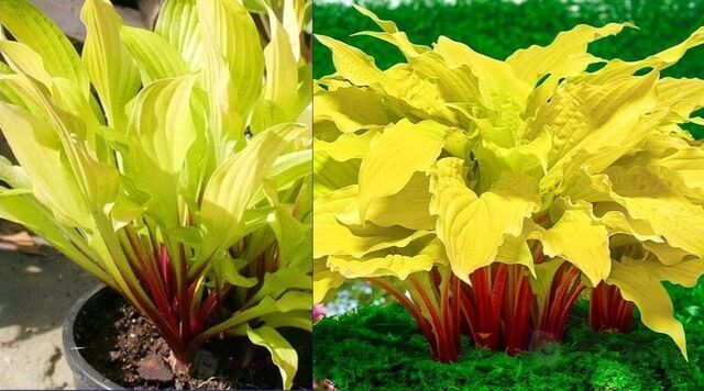 Довольно компактный сорт высотой до 30 см, диаметром 50 см. Эффектные сине-зеленые листья с золотисто-желтым центром, увеличивающимся в размерах по мере вегетации.