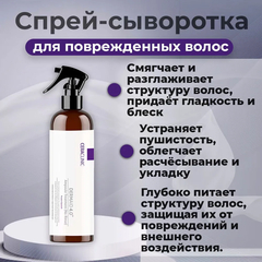 Термозащитный спрей с усиленными протеинами и пептидами надежно защищает волосы от повреждений утюжков и фена, удерживает влагу и восстанавливает кутикулу. Подходит для всех типов волос, не требует смывания.