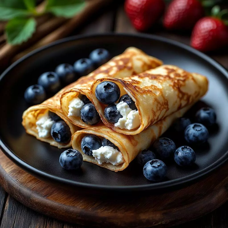Тонкие блинчики с творожно-ягодной начинкой — идеально к чаю.