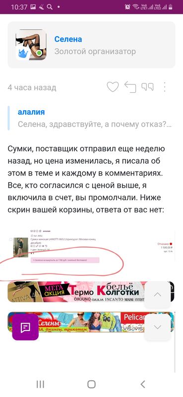 Селена, даже на скрине в комментариях к заказу видно, что я согласилась на выкуп по той цене, которую Вы предложили. Я прописала это в комментариях в тот-же день, в который Вы просили. Вот в скрине же розовым видно, что я согласна на выкуп. Теперь получается я остаюсь без сумки?