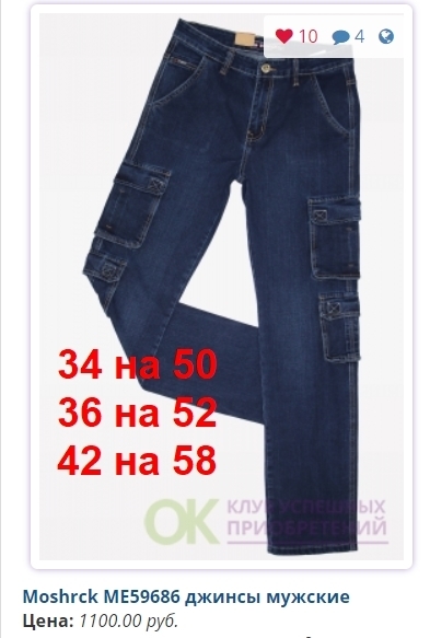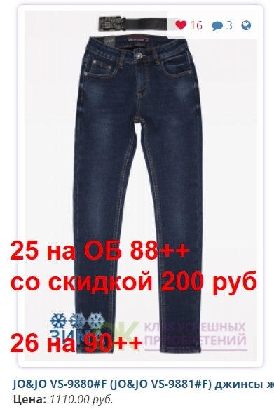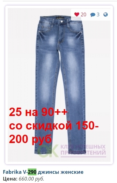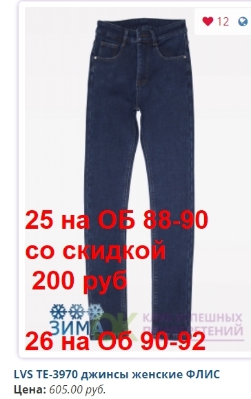 - Скидка предоставляется за счет Участников, занявших самые востребованные размеры: в женских моделях - 27, 28, 29, 30; в мужских - 31,32,33,34,35,36,38..... И Конечная стоимость джинсов для них будет больше на 30-50 рублей.