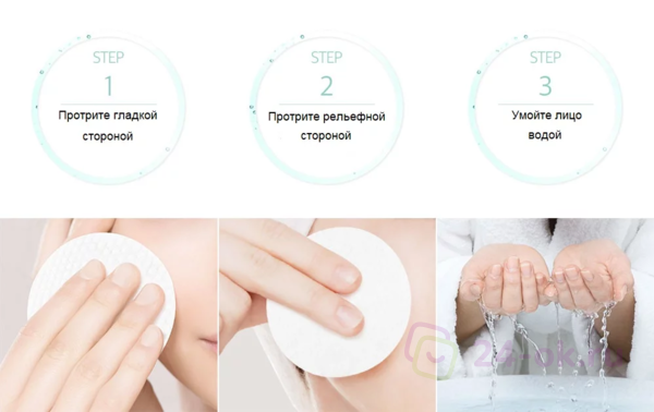 После умывания протереть кожу рельефной стороной салфетки, затем гладкой стороной средства.