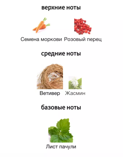 Ноты: ветивер, жасмин, морковь, пачули, розовый перец