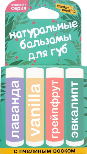 | Набор из 4-х популярных 100% натуральных бальзамов для губ с пчелиным воском 100% натуральный бальзам для губ с пчелиным воском "ЭВКАЛИПТ-ЛИМОН" 100% натуральный бальзам для губ с пчелиным воском "МАНДАРИН" 100% натуральный бальзам для губ с пчелиным воском "МЯТА" 100% натуральный бальзам для губ с пчелиным воском "ГРЕЙПФРУТ" Нанести небольшое количество бальзама на кожу губ. Использовать при необходимости, особенно в сухую, жаркую, холодную, ветреную погоду. Используйте бальзам для защиты лица и рук в зимнее время года, для снятия зуда после укусов насекомых |