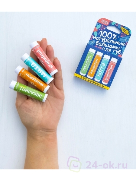 100% натуральные бальзамы для губ ЭВКАЛИПТ-ЛИМОН, МАНДАРИН, МЯТА, GRAPEFRUIT, коробка 4 штуки