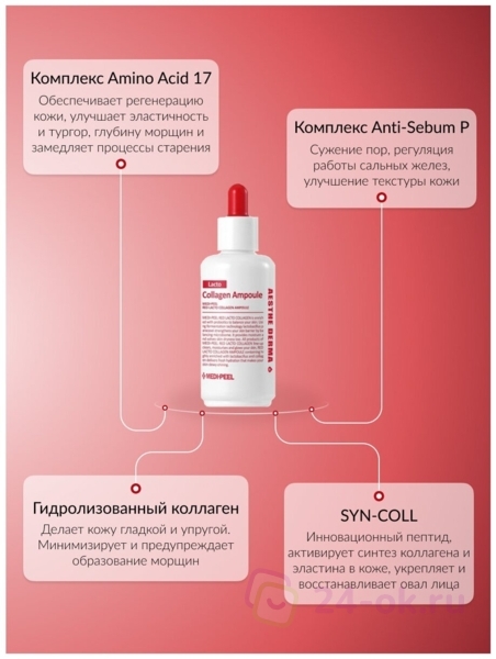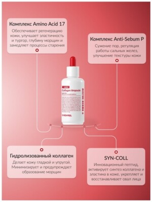 Коллагеновая ампула с лактобактериями и аминокислотами Medi-Peel Red Lacto Collagen Ampoule делает кожу более плотной и крепкой, разглаживает микрорельеф, восстанавливает упругость и эластичность. Ампула обладает подтягивающим действием, помогает в борьбе с расширенными порами, улучшает текстуру кожи.