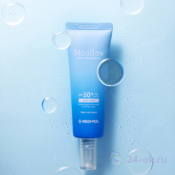 Ультраувлажняющая солнцезащитная сыворотка Medi-Peel Aqua Mooltox Water-Fit Sun Serum SPF 50+ PA++++ на основе стабильных химических фильтров нового поколения обладаёт лёгкой невесомой текстурой и совсем незаметен на коже. Мгновенно наполняет влагой, избавляет от сухости и стянутости.