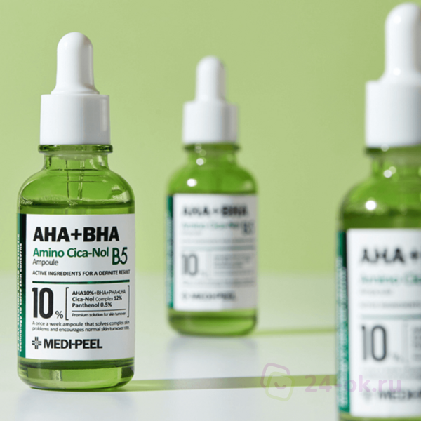 Отшелушивающая ампула с кислотами и центеллой Medi-Peel AHA BHA Amino Cica-Nol B5 Ampoule эффективно удаляет омертвевшие клетки эпидермиса, шелушения и сухость. Смягчает огрубевшие участки кожи, полирует и активизирует процессы регенерации. Формула, сбалансированная успокаивающими компонентами, не провоцирует появления раздражение и зуда.