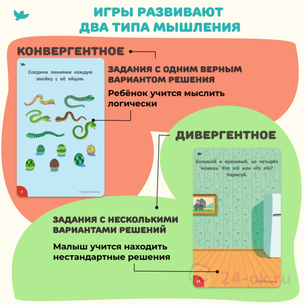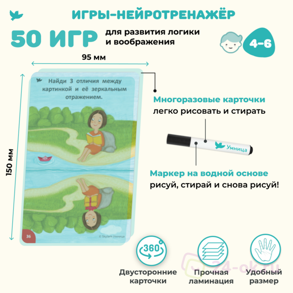 Игры и головоломки внутри набора разнообразные, сопровождаются красочными иллюстрациями, поэтому даже неусидчивые дети надолго увлекаются ими. Очень важно, что все задания можно выполнять по несколько раз. Для этого карточки покрыты ламинацией – маркер на водной основе легко стирается с них с помощью обычной салфетки. Таким образом, вы можете исправить ошибку, найти альтернативное решение, использовать карточки для нескольких человек. Набор прослужит вам очень долго, ведь наши развивающие карточки качественные, плотные, а игры – увлекательные и имеют вариативные решения. Что очень полезно для детского мозга!