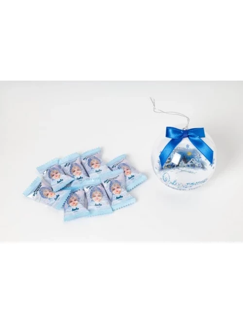 Подарочный набор в форме шара, внутри фигурные конфеты, покрытые натуральным молочным шоколадом с темной начинкой с добавлением тертого арахиса и дробленой вафли. С возможностью использования в качестве елочной игрушки.