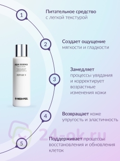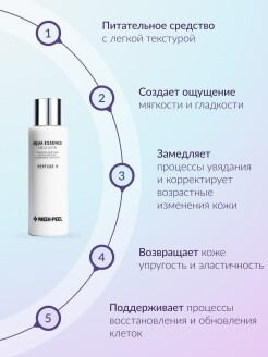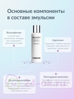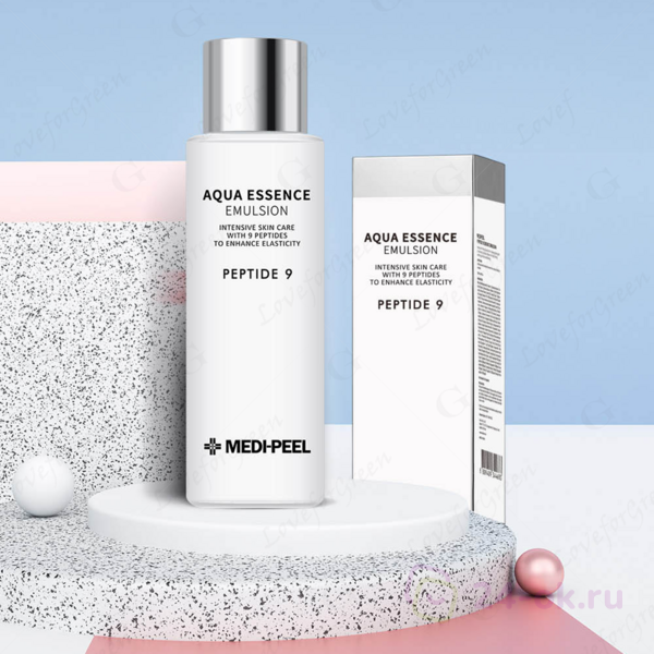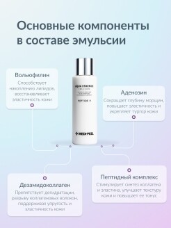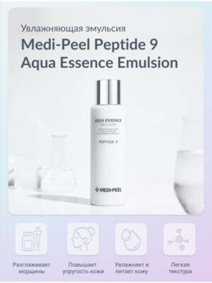Увлажняющая и восстанавливающая эмульсия для лица с пептидами Aqua Essence Emulsion Peptide 9 Medi-Peel 250 мл разглаживает небольшие и делает менее заметными глубокие возрастные заломы, восстанавливает «поплывший» овал, улучшает тургор, осветляет пигментацию, помогает избавиться от тусклого неоднородного цвета лица.