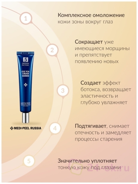 Омолаживающий лифтинг-крем для век с пептидным комплексом MEDI-PEEL 5 Growth Factors Eye Tox Cream ухаживает за зрелой кожей и замедляет процессы старения.