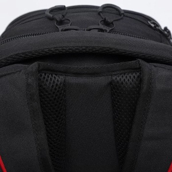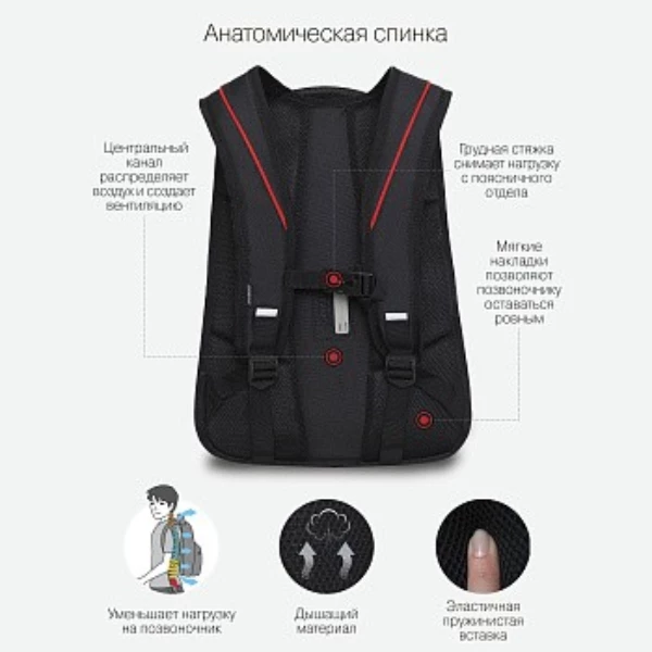 Чтобы при полной загрузке школьного рюкзака меньше уставала спина, мы сделали жесткую анатомическую спинку с накладками и нагрудную стяжку со свистком. Ребенок сохраняет правильную осанку.