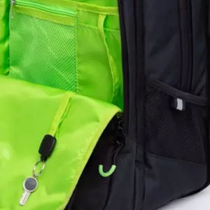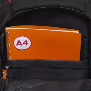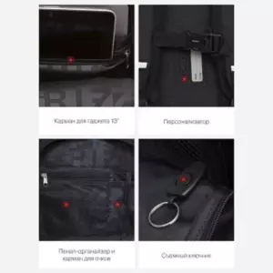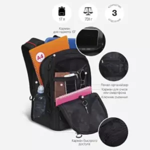 В рюкзаке 3 основных отделения: для книг или крупных вещей; для тетрадей, папок и документов (А4); для принадлежностей. Внутри мы сделали карман для ноутбука 13” и брелок для ключей. Есть внешний карман и 2 боковых сетчатых: для воды и ланч-бокса. Вещи лежат на своих местах.