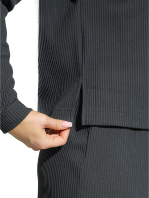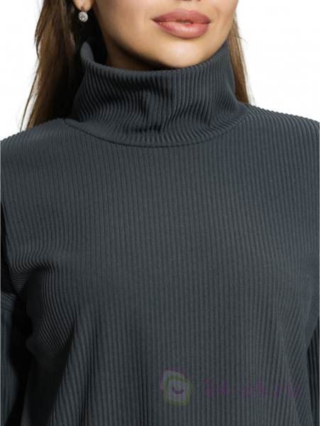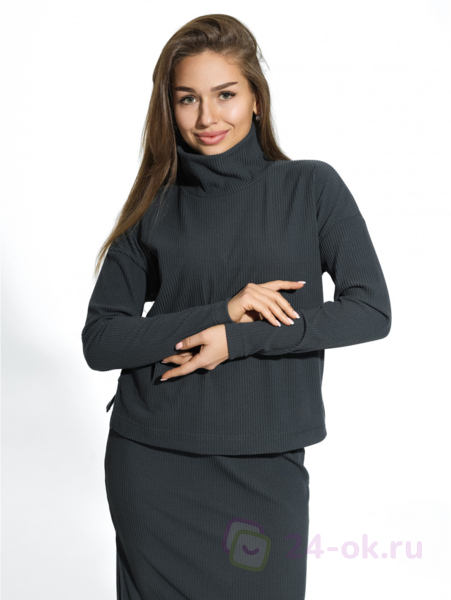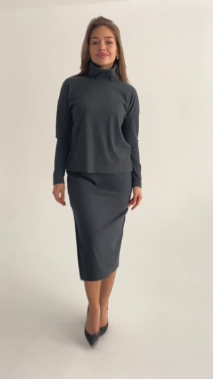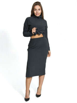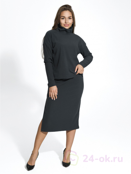Ряд: 44-54, Состав: 65% вискоза ; 25% кашемир ;10% эластан, Ткань: кашкорсе лапша кашемир, Цвет: графит Описание Костюм женский состоит из свитшота и юбки. Свитшот прямого кроя с втачным длинным рукавом и спущенным плечом. Юбка прямого силуэта с цельнокроеным поясом и разрезом в левом боковом шве.