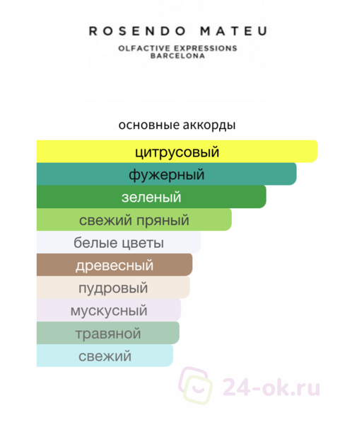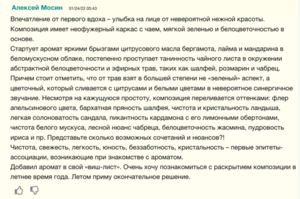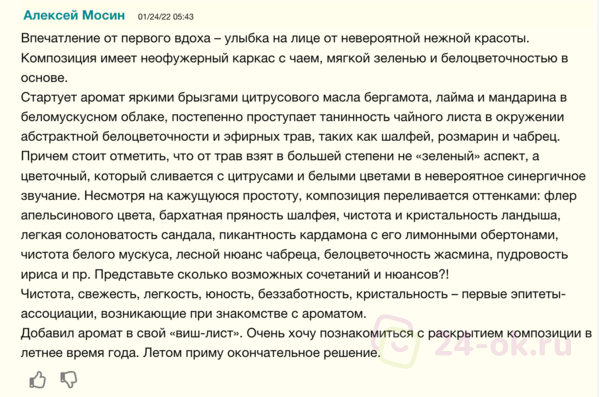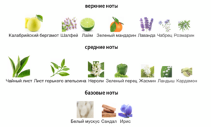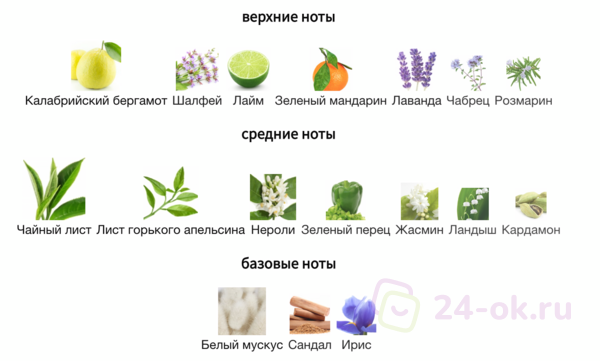 Ноты: ландыш, ирис, калабрийский бергамот, зеленый мандарин, сандал, зеленый перец, шалфей, лайм, нероли, розмарин, кардамон, жасмин, лаванда, чабрец, белый мускус, чайный лист