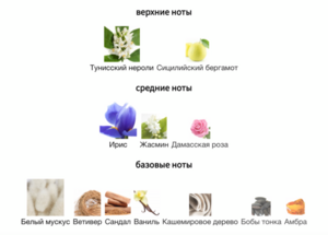 Ноты: сандаловое дерево, ирис, калабрийский бергамот, нероли из туниса, кашемировое дерево, амбра, итальянский ирис, ваниль, жасмин, ветивер, белый мускус, дамасская роза