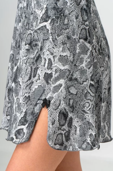Ночная сорочка выполнена из натурального 100% хлопка. Волнистые рюши, маленький атласный бантик и небольшой разрез добавят образу нотку кокетства. Принт, вдохновленный природной красотой и гибкостью змеи, подчеркивает женственность и добавляет чувственности. Свободный крой дарит комфорт и не стесняет движений, такая сорочка идеальна для уютного вечера.