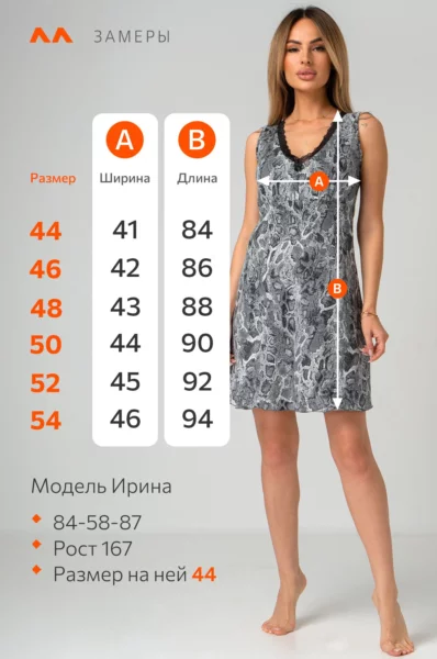 Модель Ирина, рост 167 см, параметры: 84-58-87. На ней сорочка 44 размера.
