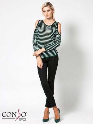 75% вискоза, 25% полиамид Стильный джемпер свободного силуэта «летучая мышь» средней длины. Модель со спущенной линией плеча, оформленной широкими разрезами. Обтачка по глубокому круглому вырезу, рукавам и низу. Джемпер выполнен из тонкого трикотажа безупречного качества и оформлен принтом в полоску.