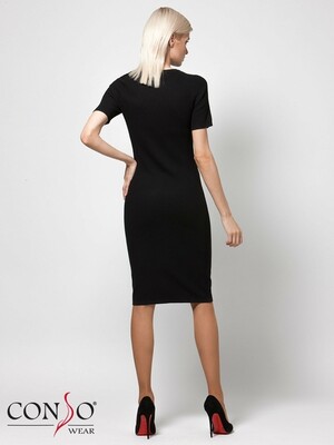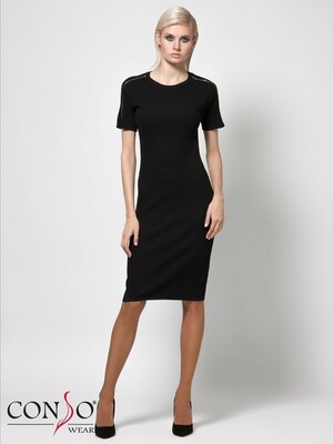 73% вискоза, 27% нейлон Универсальное платье прямого силуэта длиной до колен. Модель с круглым вырезом и короткими рукавами, оформленными молниями. Платье из мягкого фактурного трикотажа прекрасно сидит и отлично смотрится.