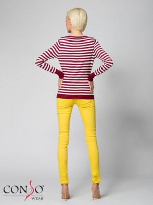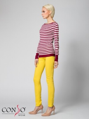 65% вискоза, 35% нейлон Стильный, слегка удлиненный джемпер. Широкий вырез-лодочка по горловине с необработанными краями. Манжеты и низ с рельефной обвязкой – для безупречной посадки. Модель изготовлена из плотного эластичного трикотажа и оформлена принтом в полоску. Фактурная перфорация – заключительный модный штрих.