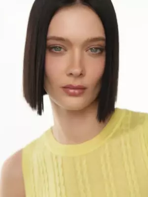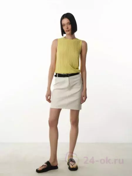 70% вискоза, 30% нейлон Укороченный топ из легкого фактурного трикотажа подчеркивает фигуру и создает женственный образ. Современная классика для ярких или спокойных луков. Материал – мягкий, приятный и простой в уходе трикотаж. Топ декорирован изящными вертикальными вязаными косами, которые визуально вытягивают силуэт. Круглая горловина, пройма и низ изделия отделаны резинкой в тон. Приятный желтый цвет ассоциируется с солнцем, теплом и обеспечит яркие эмоции.