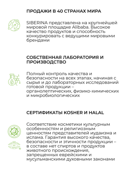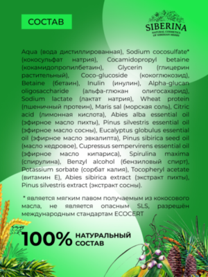Aqua (вода дистиллированная), Sodium cocosulfate* (кокосульфат натрия), Cocamidopropyl betaine (кокамидопропилбетаин), Glycerin (глицерин), Coco-glucoside (кокоглюкозид), Betaine (бетаин), Inulin (инулин), Alpha-glucan oligosaccharide (альфа-глюкан олигосахарид), Sodium lactate (лактат натрия), Wheat protein (пшеничный протеин), Maris sal (морская соль), Citric acid (лимонная кислота), Abies alba essential oil (эфирное масло пихты), Pinus silvestris essential oil (эфирное масло сосны), Eucalyptus globulus essential oil (эфирное масло эвкалипта), Pinus sibirica seed оil (масло кедровое), Cupressus sempervirens essential oil (эфирное масло кипариса), Spirulina maxima (спирулина), Вenzyl аlcohol (бензиловый спирт), Potassium sorbate (сорбат калия), Tocopheryl acetate (витамин Е), Abies sibirica extract (экстракт пихты), Pinus silvestris extract (экстракт сосны).