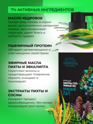 Натуральный шампунь-гель сочетает полезные свойства как для кожи, так и для волос. МАСЛО КЕДРОВОЕ питает кожу головы и корни волос, дополнительно увлажняет локоны, восстанавливает структуру, дарит блеск и мягкость прядям. ПШЕНИЧНЫЙ ПРОТЕИН обладает увлажняющими и смягчающими свойствами. ЭФИРНЫЕ МАСЛА ПИХТЫ И ЭВКАЛИПТА укрепляют волосы и предотвращают появление перхоти, очищают и тонизируют. ЭКСТРАКТЫ ПИХТЫ И СОСНЫ ускоряют процесс кровообращения, тем самым стимулируют рост волос.