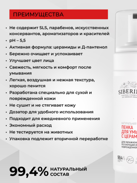 Siberina Для лица Серия с церамидами / НАТУРАЛЬНАЯ ПЕНКА ДЛЯ УМЫВАНИЯ
