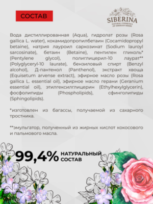 Aqua (вода дистиллированная), Rosa gallica L. water (гидролат розы), Cocamidopropyl betaine (кокамидопропилбетаин), Sodium lauroyl sarcosinate (натрия лауроил саркозинат), Betaine (бетаин), Pentylene glycol* (пентилен гликоль), Polyglyceryl-10 laurate** (полиглицерил-10 лаурат), Benzyl alcohol (бензиловый спирт), Panthenol (Д-пантенол), Equisetum arvense extract (экстракт хвоща), Rosa gallica L. essential oil (эфирное масло розы), Geranium essential oil (эфирное масло герани), Ethylhexylglycerin (этилгексилглицерин), Phospholipids (фосфолипиды), Sphingolipids (сфинголипиды).