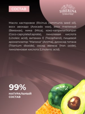 Масло касторовое (Ricinus communis seed oil), воск авокадо (Avocado wax), воск пчелиный (Beeswax), мика (Mica), коко-каприлат/капрат (Coco-caprylate/caprate), линолевая кислота (Linoleic acid), витамин Е (Tocopherol), пищевой ароматизатор "Малина" (Aroma), диоксид титана (Titanium dioxide), оксид железа (Iron oxide), линоленовая кислота (Linolenic acid).