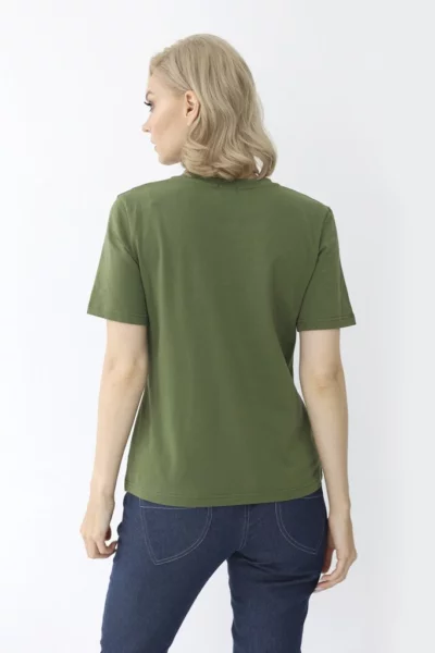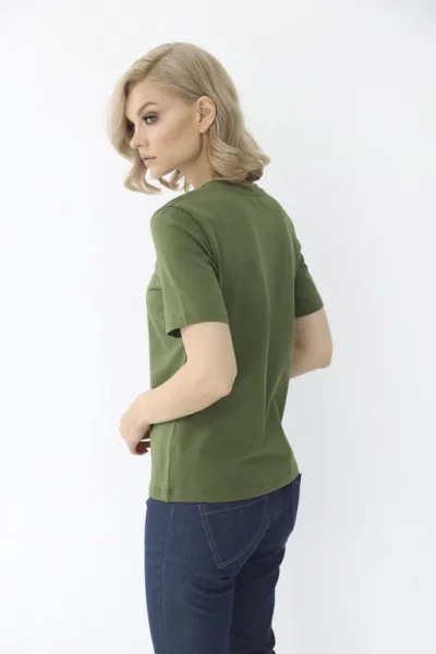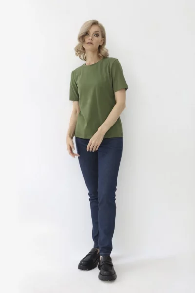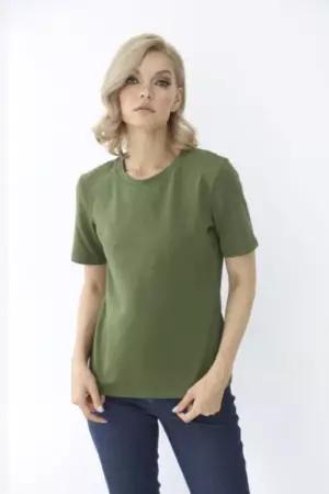 Футболка прямого силуэта с круглой горловиной и втачным рукавом. Выполнена из легкого приятного к телу трикотажа на основе хлопка с добавлением лайкры.