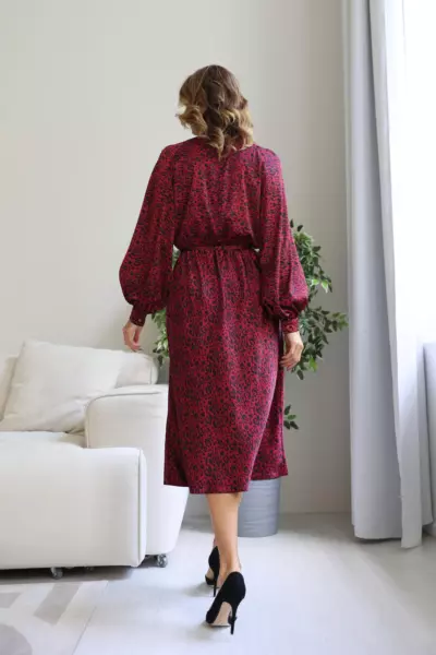 Платье миди с юбкой- трапеция, с резинкой по линии талии. Сборка по переду лифа переходит в воротник-стойку, застёгивается сзади на пуговицу. Пышный рукав на манжете.