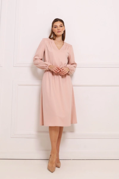 Платье отрезное по линии талии, с резинкой. V-вырез горловины, кокетка со сборкой по переду, втачные рукава с резинкой по манжете.