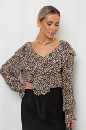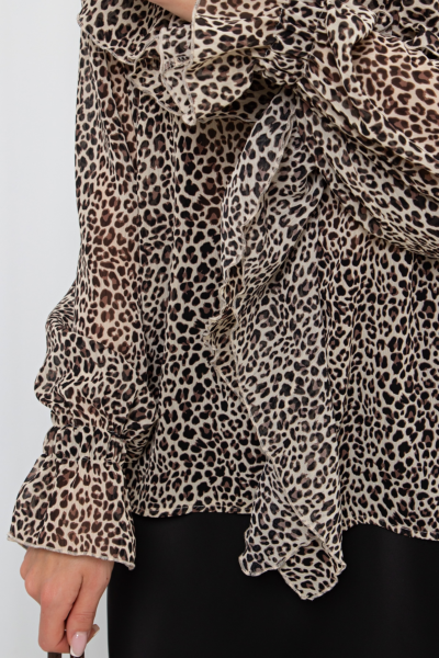 Цвет: коричневый/леопард, Ткань: 100% полиэстер ОПИСАНИЕ Стильная блузка свободного кроя. V - образная горловина оформлена воланом с переходом на спинку и полочку. Длинный втачной рукав по запястью присборен на резинку. Низ ровный, без разрезов. Рекомендуемая стирка при t не более 30°. Длина изделия: 54 см Длина рукава от горловины: 71 см Рост фотомодели: 168 см Размер фотомодели: 42 Ткань: Шифон