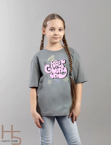 Футболка oversize с коротким рукавом. Горловина круглая, обработана узким воротником из полотна с эластаном. Перед оформлен ярким принтом.