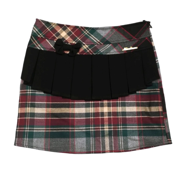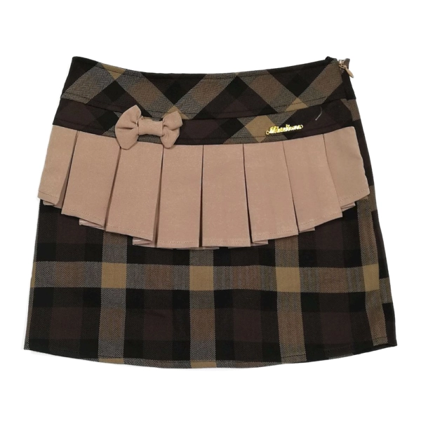 Юбка для девочки, из ткани в клетку. Прямой крой. На пояске, с баской со складочками из однотонной ткани, сзади со шлицей. На подкладе из иск.шелка. Застежка молния в левом боковом шве. С внутренней стороны пояска, вшита резинка с пуговицей, для ее регулирования. Украшена бантиком из ткани и пластиковым, золотистого цвета, фирменным знаком.