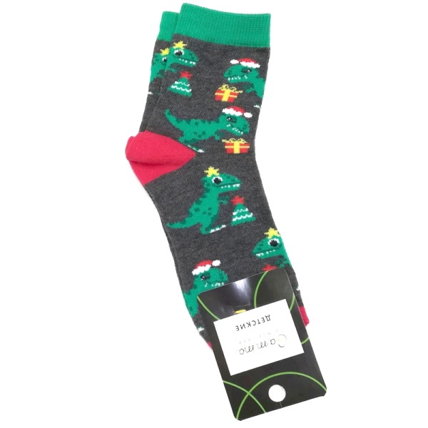 Трикотажные носки для мальчиков. Паголенок средней высоты, с эластичным широким бортиком. Модель украшена новогодним принтом "Динозаврики, подарки, ёлочки" по всей длине изделия. Резинка, мысок, пятка выделены контрастным цветом. Мысок с плоским швом.