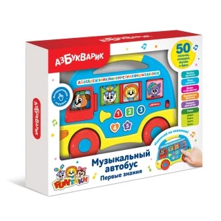 Издательство: Азбукварик Ниша: АЗБУКВАРИК-ИГРУШКИ Код книги: 4680019285917 Возраст: 3+ Серия: FUNтики Веселые песенки и первые знания – в большом музыкальном автобусе! Выбирайте один из двух режимов – обучающий или музыкальный. Нажимая на фигурные кнопочки, ребенок будет учить цифры, формы и цвета, послушает обучающие песенки (про алфавит, счет, формы и цвета, животных фермы, леса и зоопарка), детские хиты («Игрушки», «Догони», «Что такое праздник?», «Весёлые путешественники», «Чунга-чанга», «Пусть бегут неуклюже», «Весёлый автобус»), танцевальные мелодии («Антошка», «Песенка про кузнечика» и др.) и веселые звуки. Автобус можно катать – колесики у него крутятся, а еще у него открывается дверь, двигается окошко, крутится окошко-барабанчик и светится фара! Пассажиры веселого автобуса – это новые герои Фантики. Это дружная компания из шести зверят: Львенок Лева, Заюшка Зайка, Щенок Тима, Слоник Слоняша, Обезьянка Ириска и Котенок Сплюшик. Отправляйтесь в путешествие вместе с Фантиками!