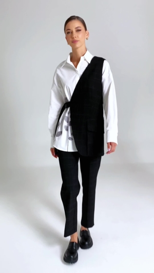 | Жилет на одно плечо с застежкой на полукольца, без рукавов. По переду талиевая вытачка. По спинке рельеф. По низу жилетки на боковом шве накладной карман с клапаном. Фигурный низ. Жилет на подкладке. | 69% ПЭ, 29% вискоза, 2% спандэкс |