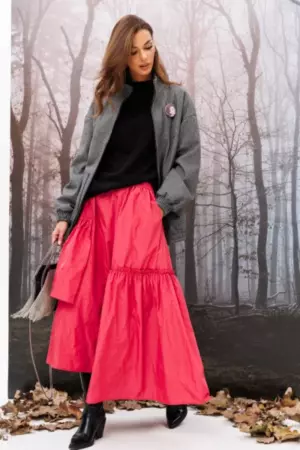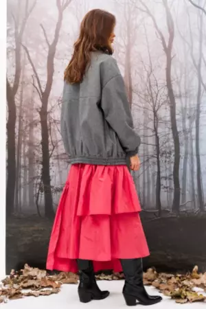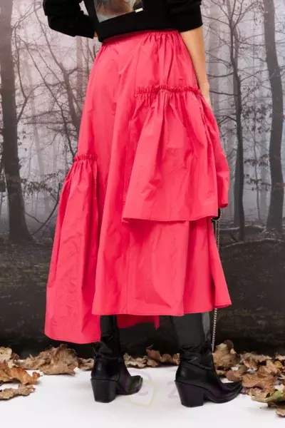 63% ПЭ, 34% хлопок, 3% эластан Юбка А-образного силуэта на приточном частично отстроченном поясе на резинке. Юбка c кармами в боковых швах и асимметрично настроченными до рельефов присборенными воланами с рюшей по боковым швам. По переду и спинке рельефы. Юбка на трикотажной подкладке. |