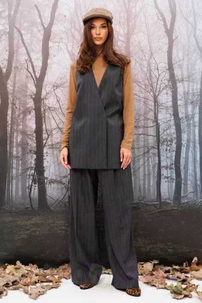 62% ПЭ 36% вискоза 2% спандекс Жилет прямого силуэта, двубортный, с V-образным вырезом. По переду нагрудные вытачки и застежка на 2 потайные пришивные кнопки. Внизу по боковым швам обработаны разрезы. Жилет на подкладке. |