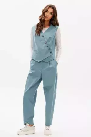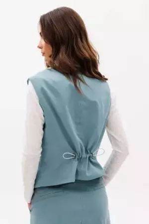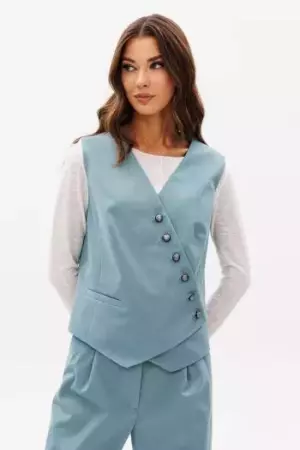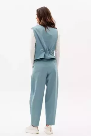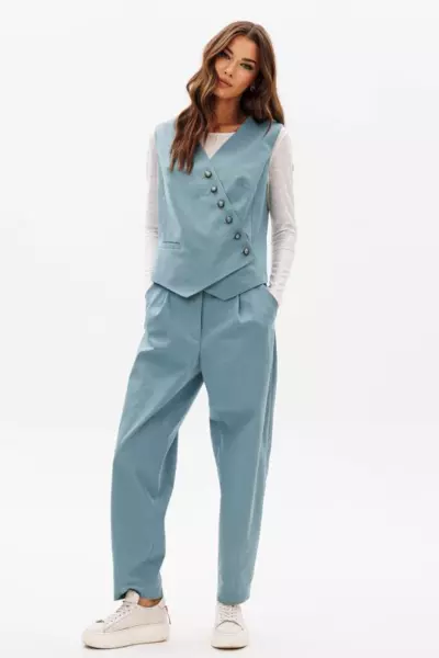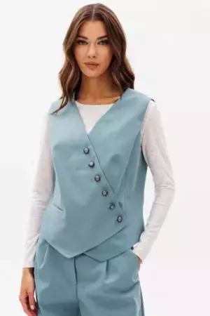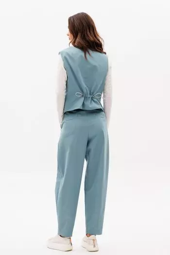 Рост: хлопок 65%; ПЭ 35%, Тип: Брючные костюмы Костюм с жилетом - прекрасное решение для смелых экспериментов. Жилет полуприлегающего силуэта с асимметричной застёжкой, фигурной линией низа и регулирующийся кулисе по спинке. Полочки с отрезным бочком и нагрудными вытачками, спинки - с центральным швом, отрезным бочком и регулирующийся кулисой с фиксаторами. Брюки "баррел" на притачном поясе со шлёвками (эластичном в области спинки), с наклонными карманами , мягкими складками защипами по верху брюк и вытачками по низу. Джемпер трикотажный, с длинным рукавом, полуприлегающего силуэта.