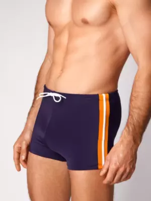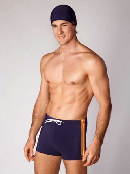 * Цвет : Синий * Состав : 80% полиамид 20% эластан * Модель: 3042YMD Мужские плавки 3042YMD бренда Indefini изготовлены из полиамида. Выполнены в темно-синем цвете. Плотно облегают тело. На талии эластичная резинка с регулирующим шнурком внутри. Принт в виде оранжевых полосок по бокам.