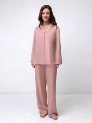 Женская пижама изготовлена из мягкой ткани, обеспечивающей комфортный сон и приятные ощущения при ношении. Футболка в комплекте оснащена отложным воротником, пуговицами в тон ткани. Штаны имеют мягкую резинку с регулирующим поясом и удобные карманы по бокам, что делает комплект практичным и уютным для сна и отдыха.