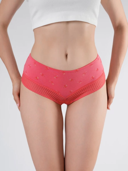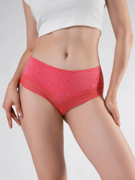 Женские трусы-шорты розовые высокой посадки плотно прилегают к телу, не сползая при носке за счет резинки на талии. Украшением трусов является принт с изображением новогодних леденцов с розовым кружевным обрамлением. Состав: 95% Хлопок; 5% Эластан._x000D_ _x000D_ Производитель: Indefini