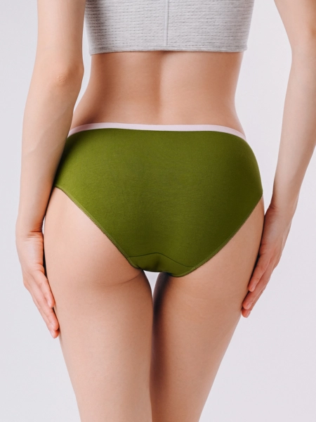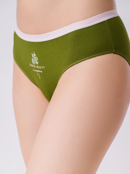 Трусы слипы женские изготовлены из натурального хлопка. Мягкая эластичная резинка на талии фиксирует трусы, не оставляя следов на коже. Зелёный цвет добавляет свежести образу, а оригинальный принт спереди привносит нотку индивидуальности. Средняя посадка делает трусы слипы универсальными для ежедневной носки. Состав: 95% Хлопок, 5% Эластан._x000D_ _x000D_ Производитель: Indefini