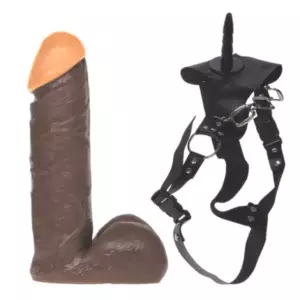 Женский страпон с реалистичной насадкой - коричневый фаллос с мошонкой оранжевого цвета. Трусики из кожзаменителя, размер регулируются ремнями-"резинками". |