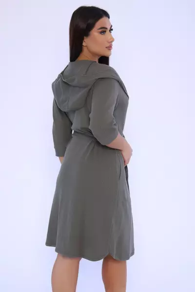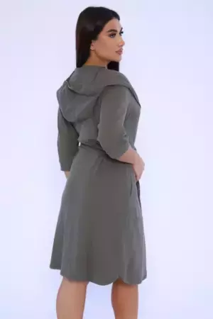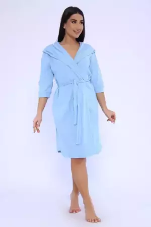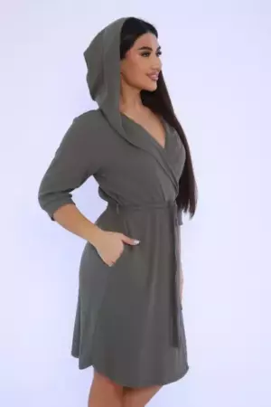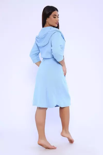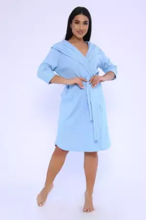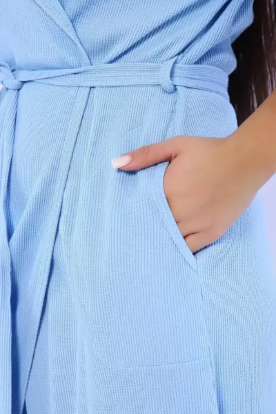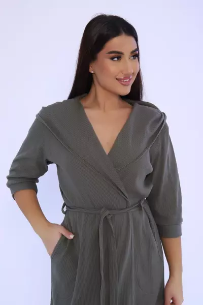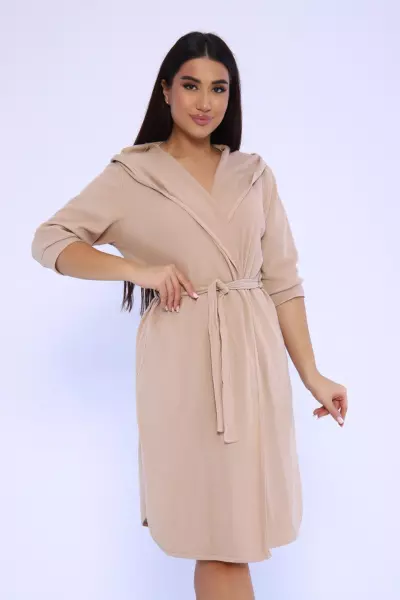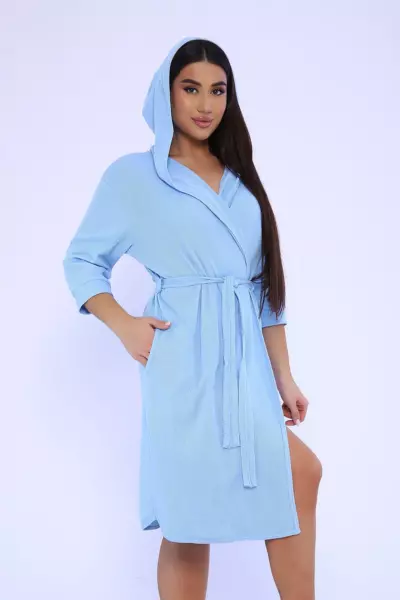 Женский халат из вафельного трикотажного полотна. Халат на запах с цельнокроеным капюшоном. Пояс на шлевках. На полочках карманы в боковом шве. Рукав 2/3 на манжете. Низ изделия закруглен к боковому шву. Халат отлично подойдет для дома, бани, сауны, SPA процедур и фитнес - клуба.